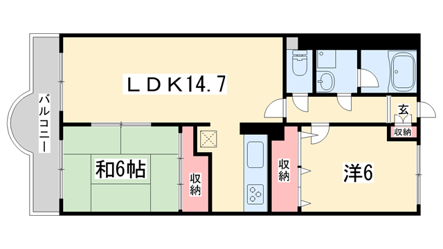 洋室6帖、和室6帖、LDK14.7帖 |