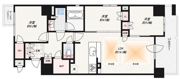 LDK14.3帖、洋室6.2帖、洋室4.5帖、洋室5帖
